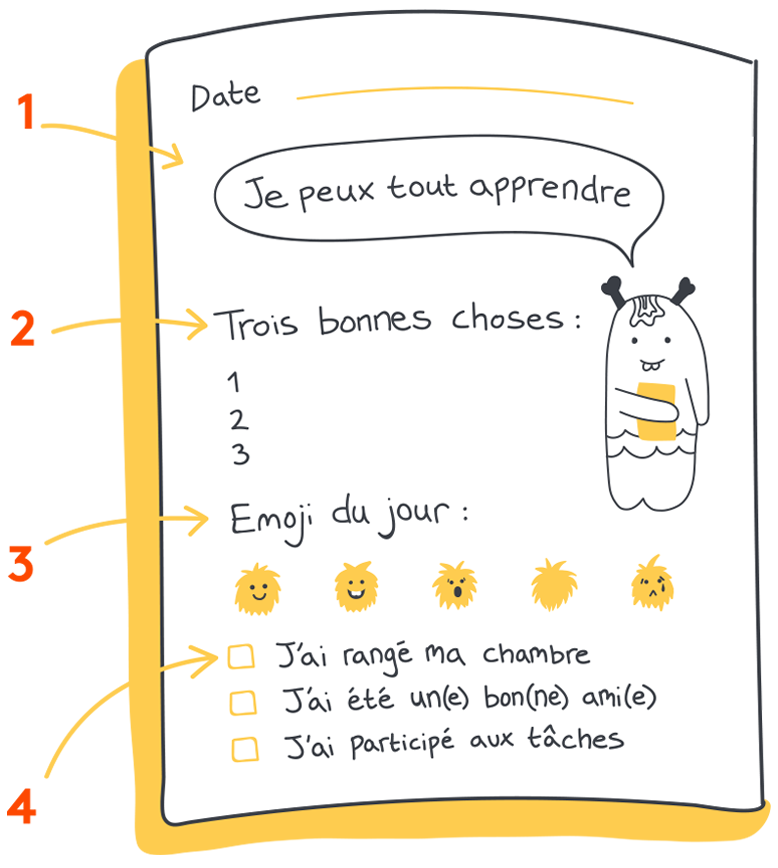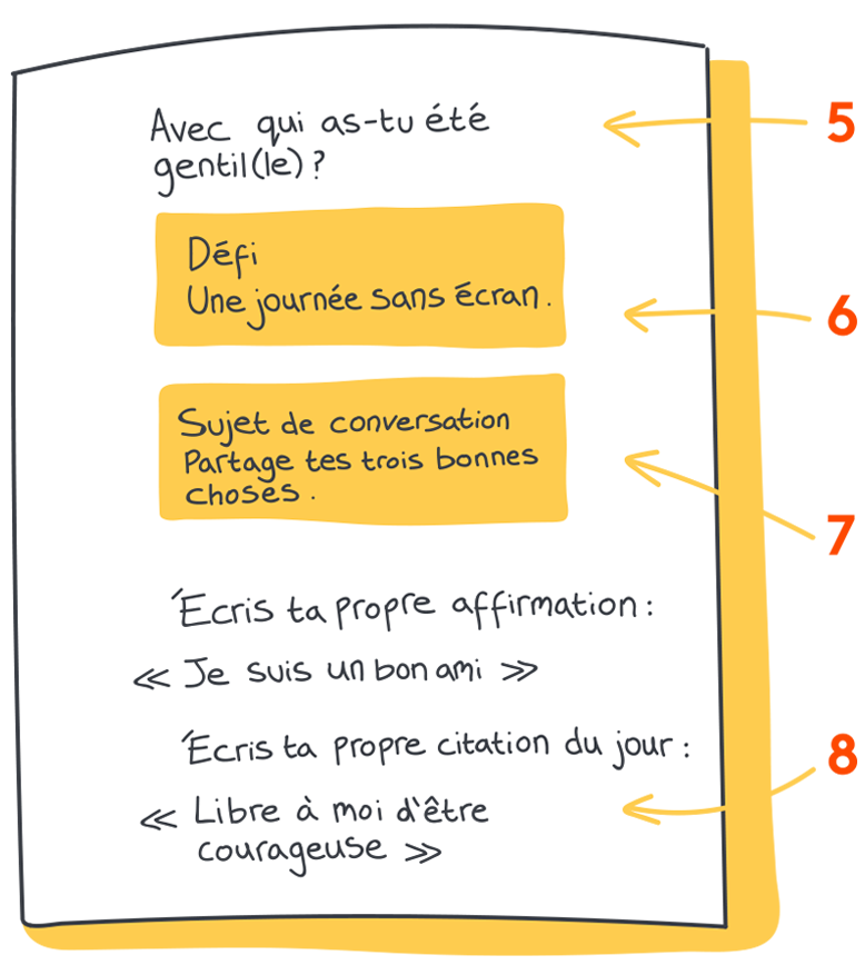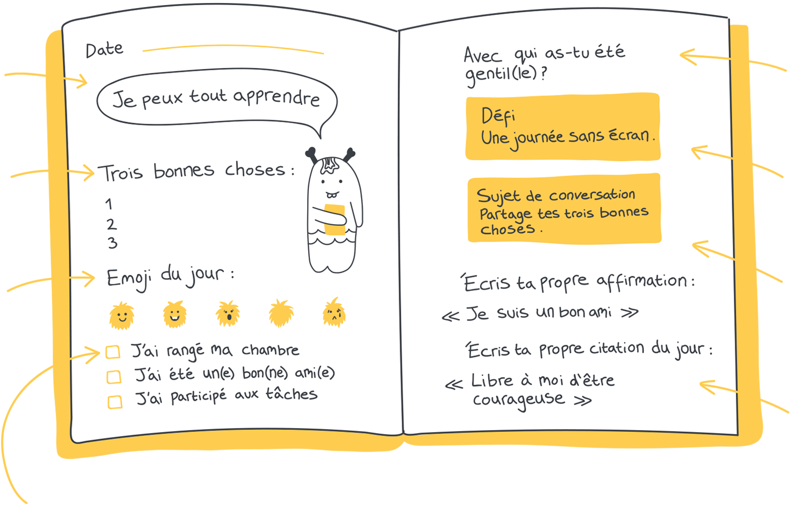 C'est bien connu : tenir un journal de gratitude est l'un des meilleurs moyens d'inspirer le bonheur, mais aussi l'un des plus simples. L'exercice de la gratitude est un pilier du journal et encourage les enfants à réfléchir à trois points positifs de leur journée. Selon les recherches, exprimer sa gratitude de cette manière augmente la sensation de bonheur et présente nombre de bienfaits physiques, psychologiques et sociaux.